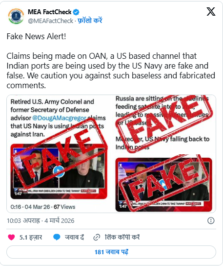 विदेश मंत्रालय के आधिकारिक फैक्ट-चेक हैंडल ने सोशल मीडिया प्लेटफॉर्म X पर स्पष्ट किया कि अमेरिका द्वारा भारतीय पोर्ट्स या नौसैनिक ठिकानों का इस्तेमाल कर ईरान पर हमला करने की बात बिल्कुल निराधार है। मंत्रालय ने कहा कि इस तरह की खबरें फर्जी हैं और लोगों को ऐसी गलत सूचनाओं से सावधान रहना चाहिए।