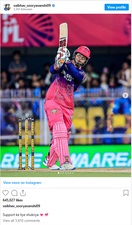 मैच जीतने के बाद वैभव सूर्यवंशी ने अपने इंस्टाग्राम अकाउंट पर कुछ तस्वीरें शेयर कीं। लेकिन सबसे ज्यादा चर्चा उनके छोटे से कैप्शन की हो रही है।
