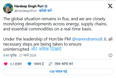 हरदीप पुरी ने यह भी स्पष्ट किया कि वर्तमान वैश्विक स्थिति को देखते हुए सरकार ऊर्जा, सप्लाई चेन और आवश्यक वस्तुओं की उपलब्धता पर लगातार नजर बनाए हुए है। उन्होंने कहा कि प्रधानमंत्री के नेतृत्व में यह सुनिश्चित किया जा रहा है कि देश में किसी भी जरूरी वस्तु की कमी न हो और आपूर्ति बिना रुकावट जारी रहे।