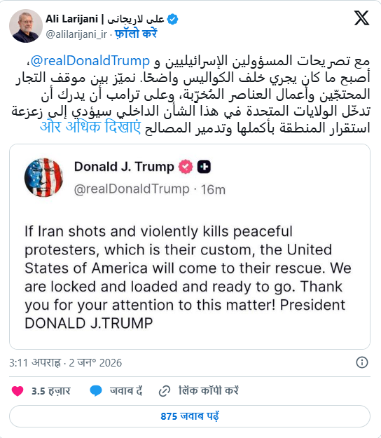 ट्रंप की इस धमकी पर ईरान की सुप्रीम नेशनल सिक्योरिटी काउंसिल के सचिव अली लारिजानी ने तीखी प्रतिक्रिया दी। उन्होंने कहा, “अमेरिका को सबसे पहले अपने सैनिकों की सुरक्षा की चिंता करनी चाहिए। हमारे आंतरिक मामलों में हस्तक्षेप करना पूरे क्षेत्र में अफरा-तफरी मचाने जैसा कदम होगा।”