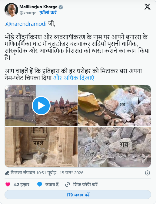 खरगे ने X पर पोस्ट करते हुए लिखा, “जी, भोंडे सौंदर्यीकरण और व्यवसायीकरण के नाम पर आपने बनारस के मणिकर्णिका घाट में बुलडोजर चलवाकर सदियों पुरानी धार्मिक, सांस्कृतिक और आध्यात्मिक विरासत को ध्वस्त कराने का काम किया है। पहले काशी विश्वनाथ कॉरिडोर के नाम पर छोटे-बड़े मंदिर और देवालय तोड़े गए, अब प्राचीन घाटों की बारी आ गई है। आपका इरादा साफ है – इतिहास की हर धरोहर को मिटाकर बस अपना नेम-प्लेट चिपका दिया जाए।” उन्होंने पोस्ट के साथ कुछ तस्वीरें और वीडियो भी शेयर किए, जिनमें बुलडोजरों से क्षतिग्रस्त संरचनाएं, टूटी मूर्तियां और पुरानी इमारतें दिखाई दे रही हैं।