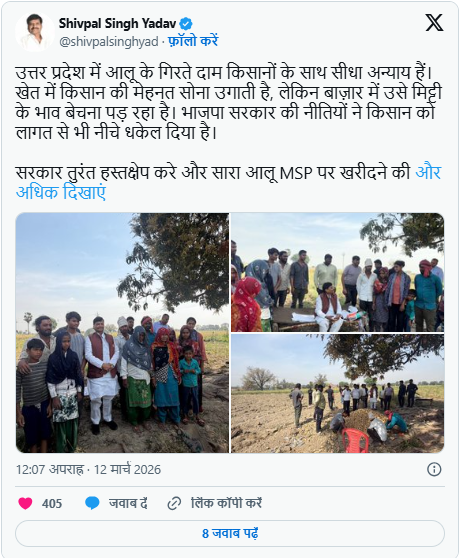 शिवपाल यादव ने कहा कि आलू के दाम लगातार गिर रहे हैं, जिससे किसानों को भारी नुकसान उठाना पड़ रहा है। उन्होंने इसे किसानों के साथ सीधा अन्याय बताते हुए कहा कि खेतों में किसान की मेहनत सोना उगाती है, लेकिन बाजार में उसी फसल को मिट्टी के भाव बेचना पड़ रहा है। उनका आरोप है कि सरकार की नीतियों के कारण किसान अपनी लागत भी नहीं निकाल पा रहे हैं।